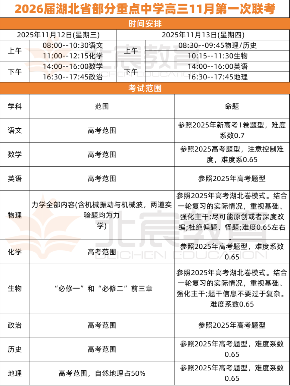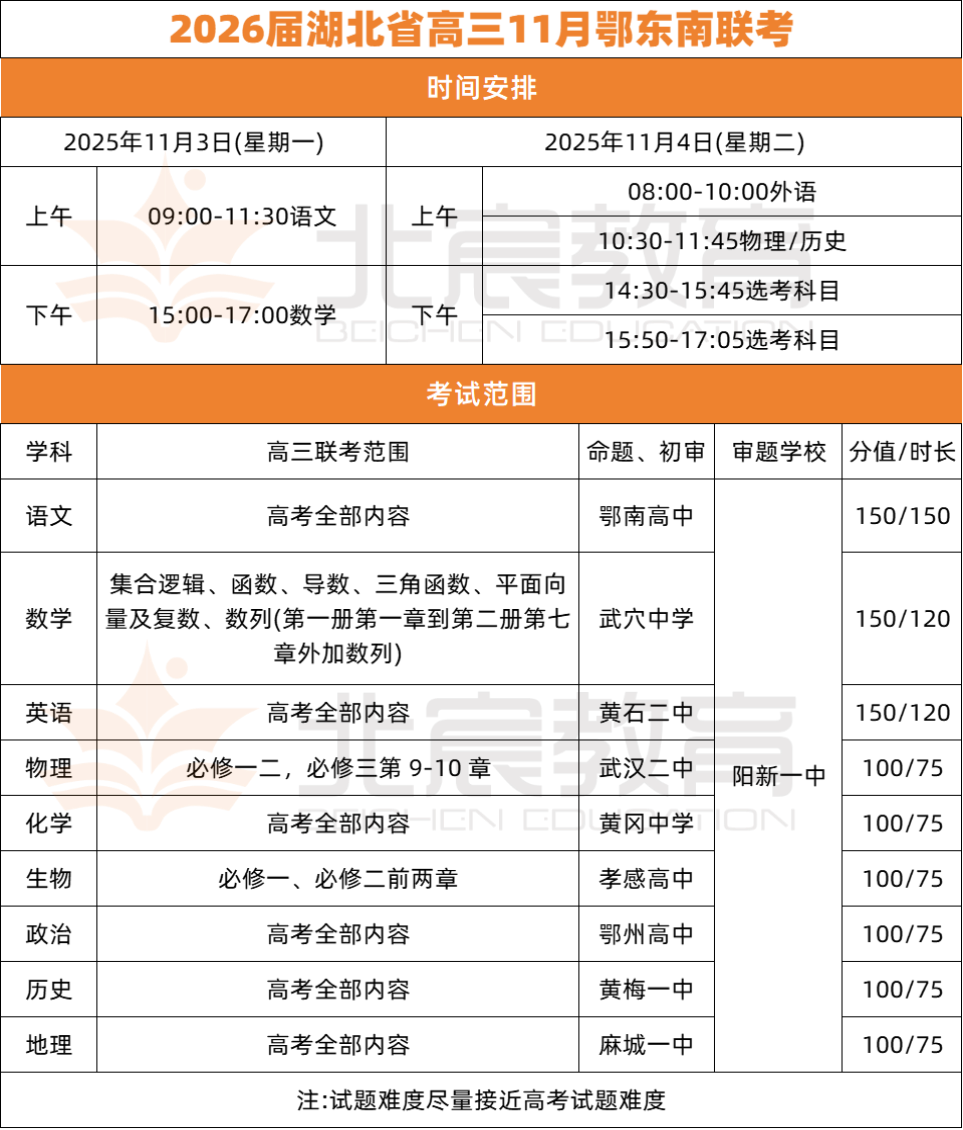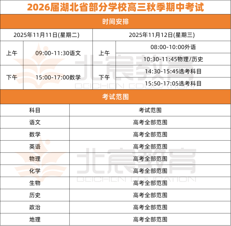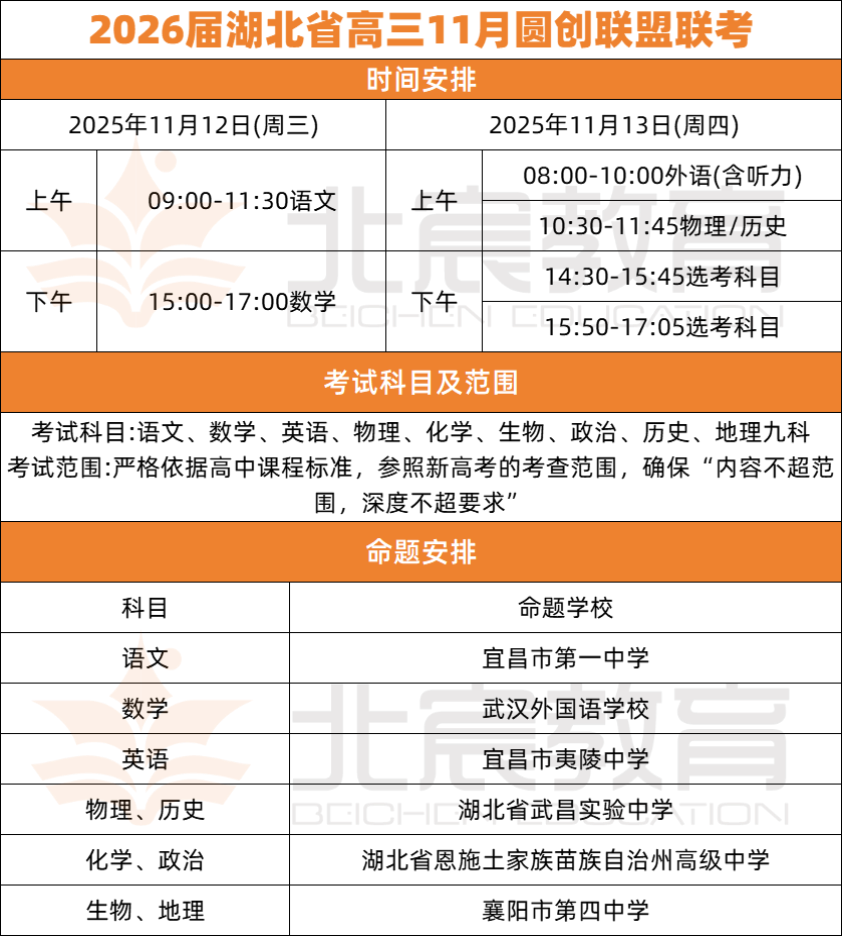 武汉北宸教育|2026届湖北省11月高三4场联考时间已公布!